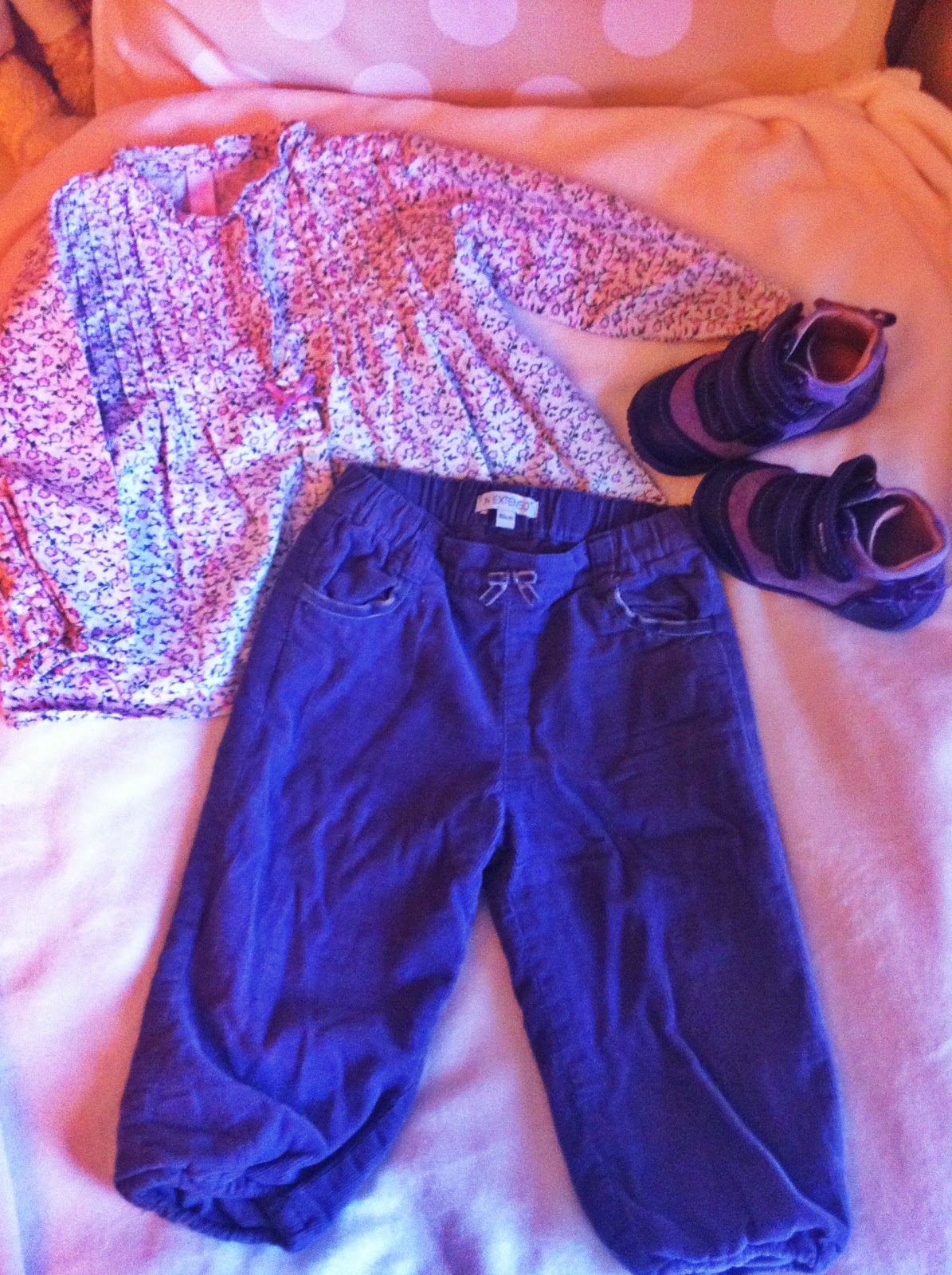 Conjunto de niña , pantalón de pana morado talla 80 cm, (aprox 12 meses). Camisa de flores talla 12 meses. Botas GARVALÍN núm. 20. Todo el conjunto 30€. Las botas sueltas 15€, pantalón y camisa 15€.
