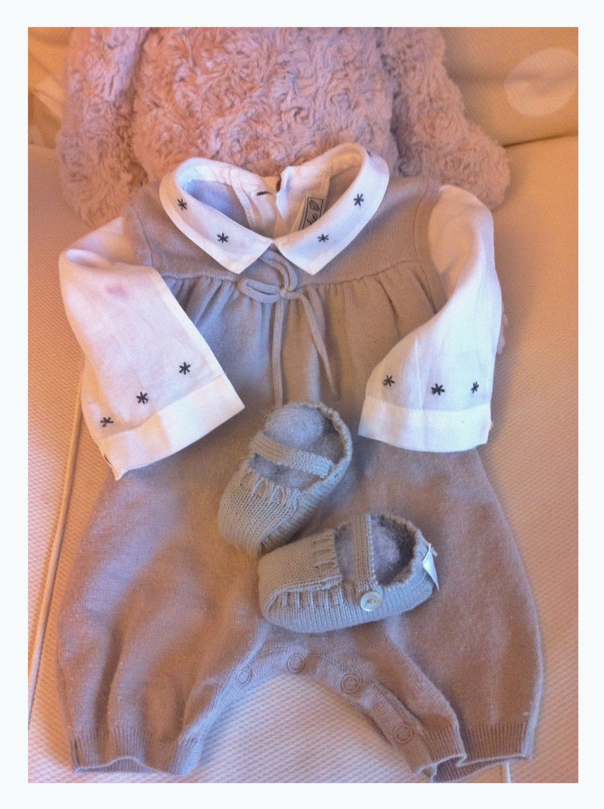 El pelele de punto y en este color gris (yo a este color ya lo llamo gris-Normandie) es muy característico de esta marca. Es de la talla 6 meses, pero como todo lo de esta marca, tallan muy muy pequeño. Mi hijo se lo puso con 2-3 meses, pero claro, las medidas de los niños ya sabemos como son. Os dejo las medidas del pelele para ver si os ajusta, si quereis más detalles me decís. Desde el hombro al tiro 28 cm y en total de largo desde el hombro 32 cm. Os dejo una foto para que veais cómo le quedaba a mi bebé. En la foto está con otra camisa, también de Normandie, que meteré en breve en el blog, pero si os interesa me lo decís. También es preciosa. El precio del pelele es de 18 euros.